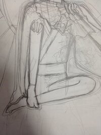 背中の描き方 (漫画・イラストの人物キャラクター描画 Tips) イラストや漫画用の簡単な背中の書き方の紹介記事です。写実の正確さよりもそれっぽく見えるものを手早く書く方法です。 正面の描き方 背中のあたりを取ります。あたりの取り方についてはこちらの記事を参照してください。 曲がった脚の描き方を、ポイントを抑えながら解説していきます まずはおよそ90度曲がった脚の描き方です。 長さを測りながらアタリを描いたら、肉付けしていきます。 ここで注目するのは 膝と膝裏 です。 膝は上でも言ったように 2段階で曲がる こと